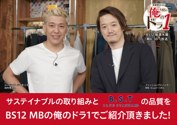そういった動きに対し、元々ファッション業界におけるサステイナビリティーに関心の高かった、MB氏の目に留まり、同氏が出演する水曜朝活テレビ“MBの俺のドラ1”でも紹介され、『Wear for Sustainability』の取組みや、『BLUE STANDARD』の品質自体への高い評価を得るとともに、放送直後より数多くの問い合わせを頂きました。