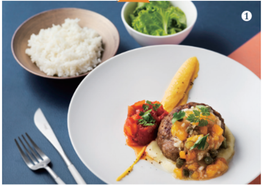 柿を使った2種類のソースに合わせて味わう秋のハンバーグプレートです。見た目も華やかな秋の一品に仕上がっています。