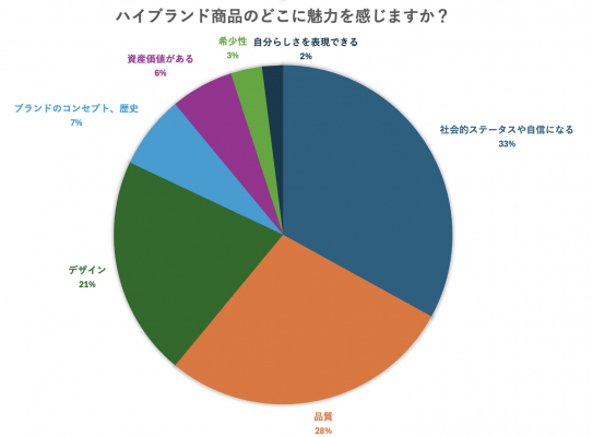 「ハイブランド商品のどこに魅力を感じますか?」のアンケート結果について、「社会的ステータスや自信になる」が33%で最多となりました。ハイブランドを身に着けることで、経済的余裕や購買力を示し、他者に対して優位性を感じると同時に、努力の成果を可視化できる点も魅力とされています。