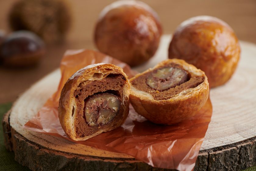 「栗の最上品」の代名詞、丹波栗を渋皮煮にし、上品な甘さの金時芋ペーストと合せて、こんがりと焼き上げました。手づくりのサクサクパイ生地の中に、ほっくり、しっとりとした丹波栗。丹波栗のまるまる一粒のおいしさをお楽しみください。