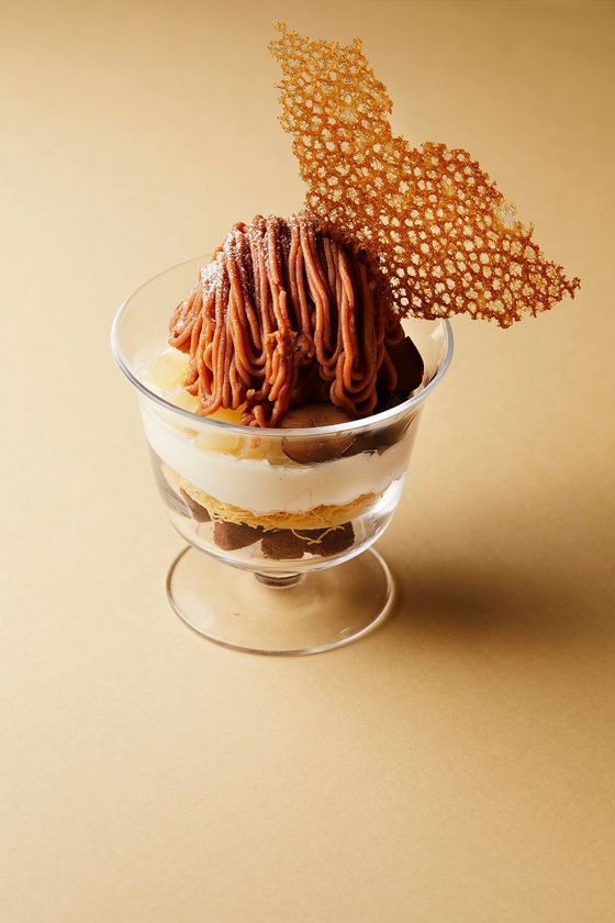 今年も好評の至福の層が魅せるモンブランパフェをご用意いたします。フランス、イタリア、国産の栗を使用したなめらかなモンブランクリームの下には、くるみのアイスクリーム、洋梨、栗の渋皮煮、クリーム状のウォールナッツ、カダイフ、チョコレートの層が美しく重なり、見た目でも魅了するボリューム満点のパフェです。