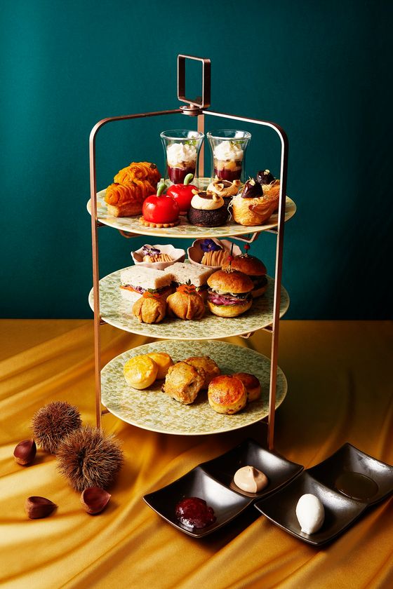 彩り豊かな秋の代表的な味覚をふんだんにご堪能いただけるアフタヌーンティーをご提供いたします。セイボリーには、秋刀魚の和風ミニバーガー、紅鮭スモークと旬の彩り野菜のサンドイッチ、銀杏とキノコの稲荷寿司、海老のムースにピンク色のビスククリームをモンブランに仕立てた逸品と、秋一色のメニューに仕上げました。