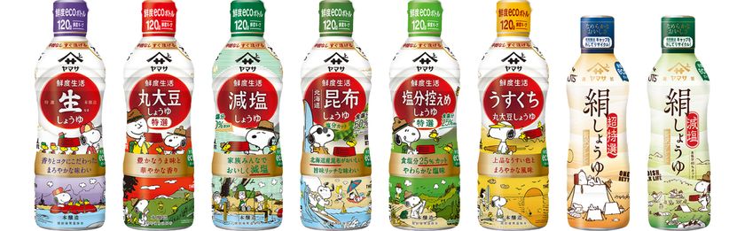 「鮮度ecoボトル」のしょうゆ8種で、スヌーピーたちが豊かな自然を楽しむストーリーが展開されているデザインボトルを数量限定販売いたします。