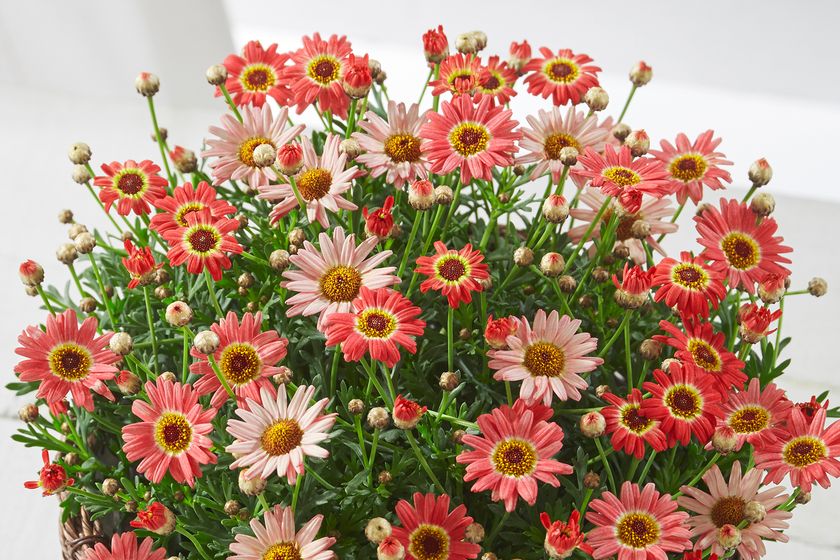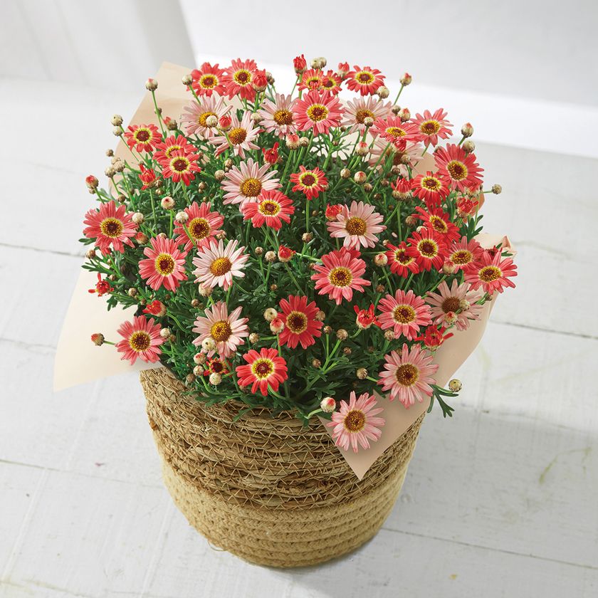 混ざり合う淡いピンクと白の花が、まさに「いちごみるく」のようなマーガレット。咲き分けと呼ばれる、咲き始めから異なる色の花がランダムに咲いていくのが特徴です。かわいらしい色合いに癒される、人気の高い品種です。