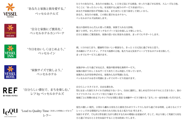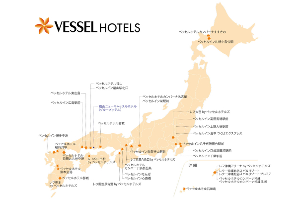 ベッセルホテルズは、「ベッセルホテルカンパーナ」「ベッセルホテル」「ベッセルイン」「REF by VESSEL HOTELS」「Lequ」の5ブランド、全国で35施設を運営しています。