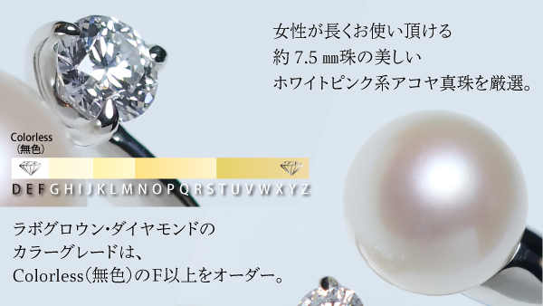 天然ダイヤモンドと組成が全く同じであるラボグロウン・ダイヤモンドですが、今回オーダーしたカラーグレードは、透明度が非常に高いColorless(無色)に属するF以上。そして、サイズは0.1カラットで、1石でペンダントとしてもお楽しみいただける大きさです。約7.5mmのアコヤ真珠と組み合わせると、しっくりと落ち着く絶妙なサイズバランスとなっております。