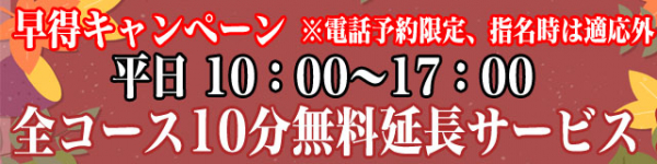 早得キャンペーンは、平日10:00~17:00の期間内に施術のご予約をいただいだお客様限定で、10分間の無料延長サービスを行っています!