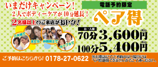 ペア得キャンペーン!は電話予約限定でおひとり様70分が3,600円(税込)とお得なキャンペーンです!