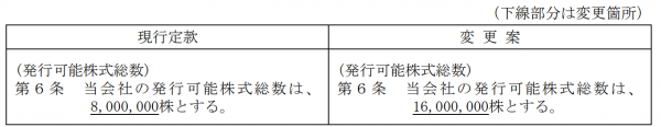 今回の株式分割に伴い、会社法第184条第2項の規定に基づき、2025年11月1日をもって、当社定款第6条に定める発行可能株式総数を変更いたします。
