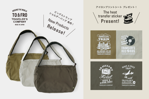 また、ビッグストラップショルダーバッグの発売とアイロンプリントシールのプレゼントは、「TRAVELER’S COMPANY」の直営店、トラベラーズファクトリー中目黒、ステーション(東京駅)、エアポート(成田空港)、京都,オンラインショップでも実施します。