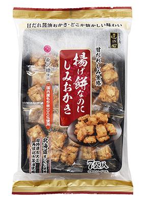 『揚げ餅なのにしみおかき』は、23年に発売された「ぬれ揚げおかき」の美味しさを引き継いだリニューアル商品。前商品のサイズよりボリュームがアップし、一口ごとに広がる旨みを存分に楽しめます。また、個包装になり保存性と利便性が向上。パッケージデザインも、伝統の味を意識し、米菓らしさがより伝わるデザインに一新しました。