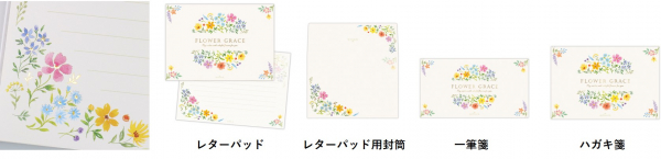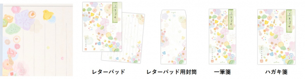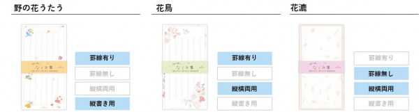一筆箋サイズの便箋と封筒がセットになった「なごみ箋」がご好評につき、今回新柄を開発。既存ラインナップでは和柄が好調なことから、可愛らしい花の和風デザインを罫線有り/無しバリエーションで複数取り揃えました。