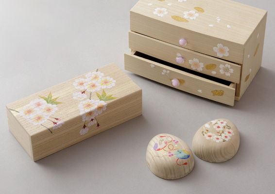 更に、日本画家や図案家、書家などにより、繊細な絵付けが施されます。華やかな花々から愛らしい動物、ユニークな縁起物までモチーフは様々。職人の美意識を融合し、桐箱を取り入れた新たなライフスタイルを提案する「箱藤商店」ならではのモノづくりをお楽しみください。