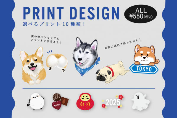 東京店限定の犬デザイン(5種)と2025年1~2月限定のオリジナルプリント5種を、対象商品のお好みの場所にプリントいたします。
