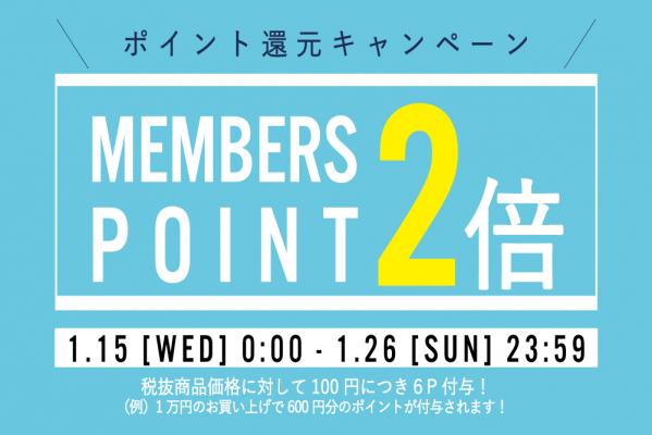 また、同期間の1/15(水)~1/26(日)には、ポイント2倍キャンペーンも、東京店・羽田店・オンラインショップにて実施いたします。