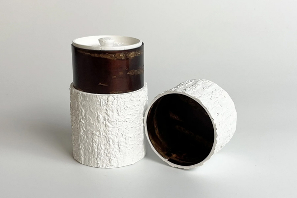 樺細工を今日的な視点で見直し、現代的な魅力を持つ工芸へとアップデートするプロジェクトのひとつ。樹皮の持つ有機的な凹凸の魅力を引き出すよう、白または黒のマット塗装を施しました。これにより伝統的な樺細工の工法では難しかった材料の使用が可能となり、限りある資源の有効活用が出来るようになりました。また内部は伝統的な工法で仕上げられ、赤く磨かれた伝統色が外装との美しいコントラストを生んでいます。