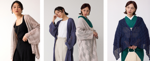 ブランドを象徴する羽織(アウター)は、糸の選定から始まり、編み柄やシルエット、そして袂の収まりを考えたパターン設計など、着物としても洋服としても美しく見える工夫がなされています。着物と洋服、どちらのスタイリングにも寄り添いながら、自分らしいスタイルを楽しむ日々に、そっと寄り添う一着としてご愛好いただいております。