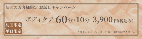 ボディケア60分+10分 ¥3,900- ※平日限定 ほかのキャンペーン・サービスとは併用できません。