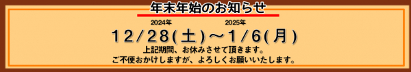 年末年始での休業期間は「2024年12月28日~2025年1月6日」まで休業となります。
