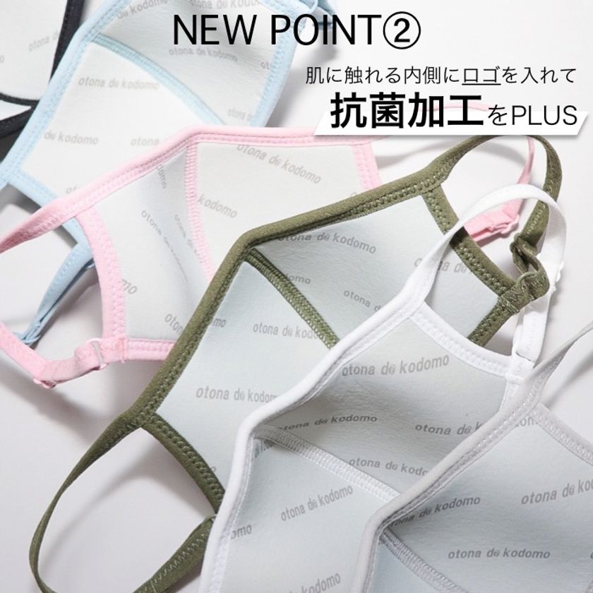 また、マスクの内側にはotonadekodomoのロゴをプリントし、さらに抗菌加工をプラスしています。おしゃれになっただけではなく、より安全にお使いいただける商品です。
