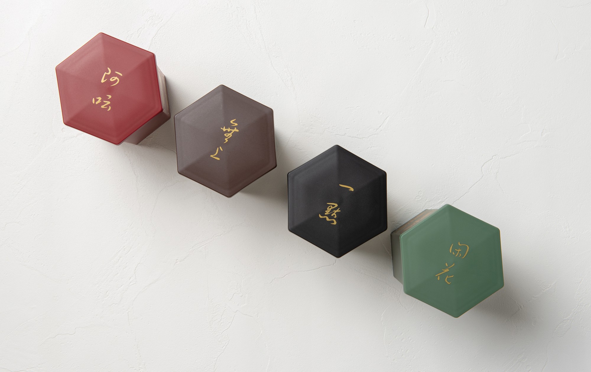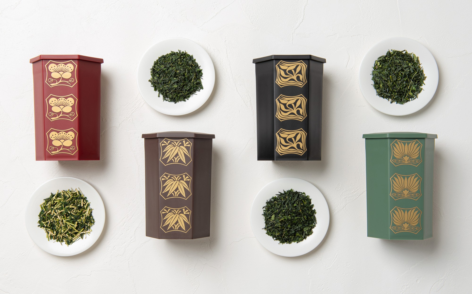 「四君子」とは、いにしえの賢人が愛した、菊(長寿)、蘭(高貴な香り)、梅(清らかな魁)、竹(生命力)の四つの花竹を指す言葉です 。その君子のごとき高潔な姿に、お茶の故事来歴を重ね合わせています 。 パッケージは、長寿を意味する亀甲を模した六角形の茶筒に、日本古来の〈金輪寺形〉と呼ばれる蓋をあしらいました 。日本の伝統ある形、色、文様を大切にしながら、現代の暮らしの中で「はんなり」とお茶を楽しんでいただくことを願ってお造りしております。