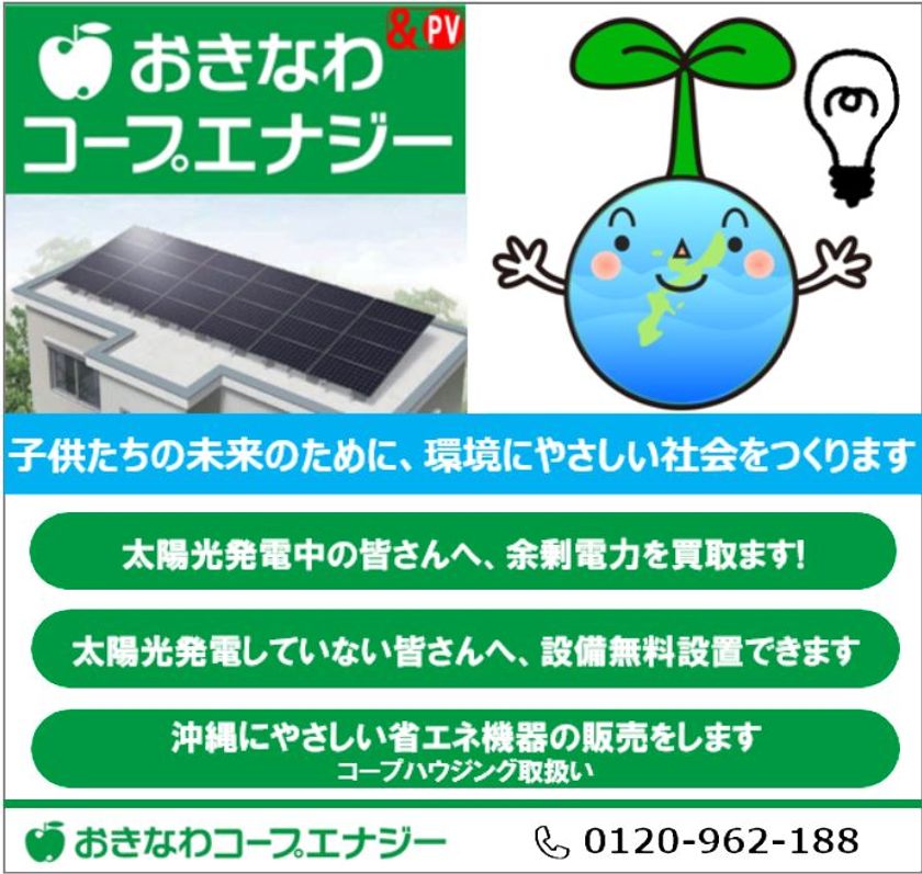 おきなわコープエナジー株式会社(代表取締役:嘉手川 繁之)は、家庭用太陽光発電設備からの余剰電力ならびに2019年11月から順次買い取り終了を迎える、卒FIT電気に関して、「太陽光買取サービス」を開始いたします。