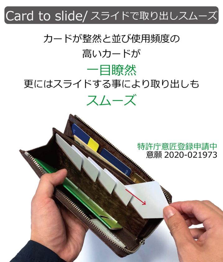 1. 使用頻度の多いカード5枚が見やすく、斜めにスライドして取り出しスムーズ<意匠登録申請中1>