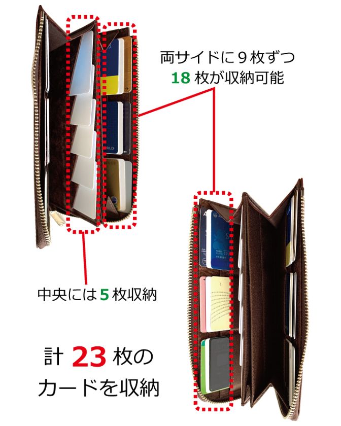 (両サイドに9枚ずつ計18枚収納、中央に5枚収納)