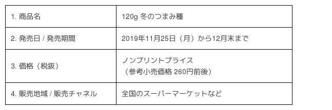 亀田製菓株式会社(本社:新潟県新潟市、代表取締役社長COO:佐藤 勇)は、『120g 冬のつまみ種』(以下:『冬のつまみ種』)を11月25日(月)から12月末までの期間限定で、全国にて発売いたします。