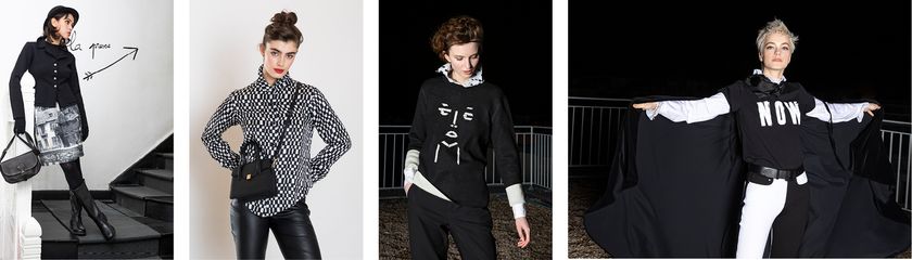 また、フェミニンな中にロックなアクセントを加えるのもアニエスベー流。アニエスベーが持っていた古いベルサイユのポストカードにインスピレーションを得て、ロックテイストなスカートやシャツなどのウェアがラインアップします。「NOW」のメッセージが印象的なTシャツは、アーティストRafael Gray(ラファエル・グレイ)とのコラボレーションピースです。