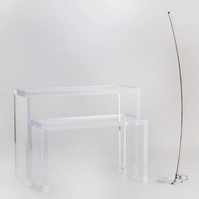 傾斜したアクリルベースに、美しく弧を描いたステンレスパイプが溶け込む、一点掛け ハンガーラック 「 Bow 」。