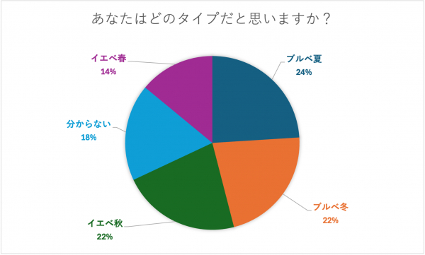 自分のタイプについては「ブルベ夏」「ブルベ冬」「イエベ秋」がほぼ同数で拮抗しており、自己認識としてはブルベ・イエベどちらも一定数いる結果となりました。