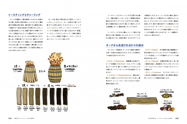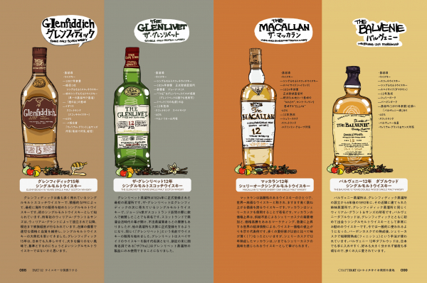 さらに、ウイスキーに関する深い知識も詳しく解説。ウイスキーの発祥から、今の姿になるまでの歴史、醸造に必要な樽の構造・種類、蒸留方法などの製造工程を、キャラクターイラスト付きで分かりやすく掲載。そして歴史的に有名な醸造家など雑学的知識も豊富に記した、ウイスキー愛好家にとってはたまらない内容です。