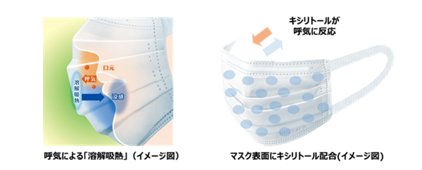 ・不織布に配合したキシリトールが呼気に含まれる水分に反応し、マスクの表面温度を低下させます。※3