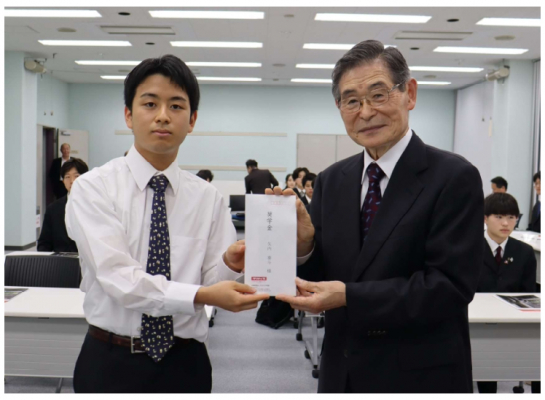 奨学生代表の矢内奏斗さん(左)と山田理事(右)