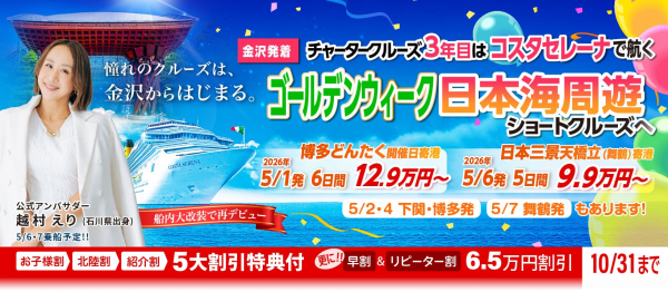 この度、大好評につき、2026年5月1日出発および5月6日出発のコスタセレーナ金沢発着チャータークルーズにおける早割・リピーター割の適用期間をさらに1か月延長し、10月31日(金)までといたしました。加えて、新たにお得な割引の適用を開始いたしましたので、下記のとおりご案内申し上げます。