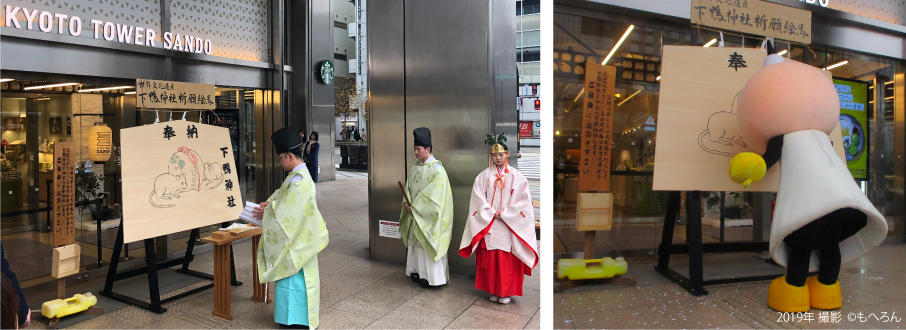 12月23日(木)から、世界遺産 賀茂御祖神社(下鴨神社)神職による祭儀奉仕の後、京都タワーマスコットキャラクター「たわわちゃん」が大絵馬に願意を書き入れます。大絵馬は12月31日(金)まで掲げ、2022年1月1日(土・祝)以降は下鴨神社に奉納されます。どなたでもご記入いただけますので、ぜひお立ち寄りくださいませ。