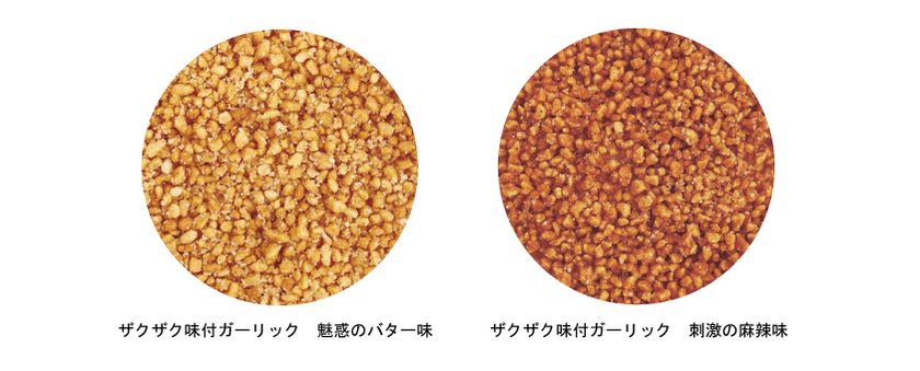 バターの芳醇な香りと香ばしいオニオンで味付けした「ザクザク味付ガーリック 魅惑のバター味」、花椒のシビれる辛さとコクのあるコチュジャンで味付けした「ザクザク味付ガーリック 刺激の麻辣味」が新登場します。
