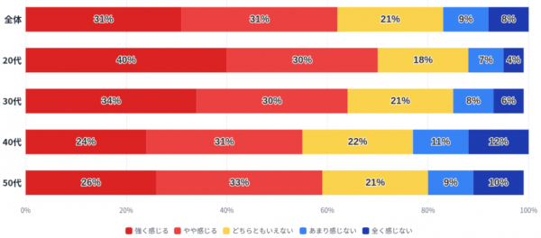 また、性別で見ると、「強く感じる」と回答した割合は男性が35%、女性が27%と差があり、一方で「全く感じない」は女性が11%と、男性(6%)を上回っています。