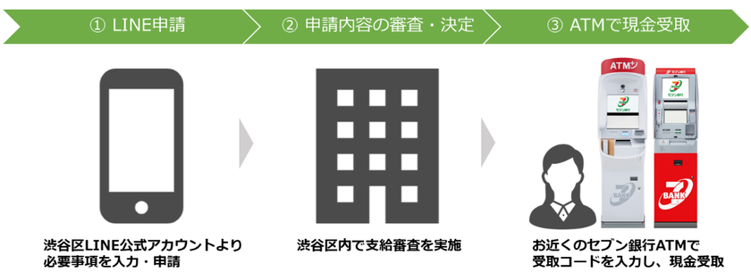 このたび、セブン・ペイメントサービスが提供する、銀行口座を介さず現金を受け取ることができる「ATM受取(現金コース)」のサービスを活用することで、渋谷区LINE公式アカウントから助成金を申請し、セブン銀行ATMから現金で受け取る仕組みを整備しました。