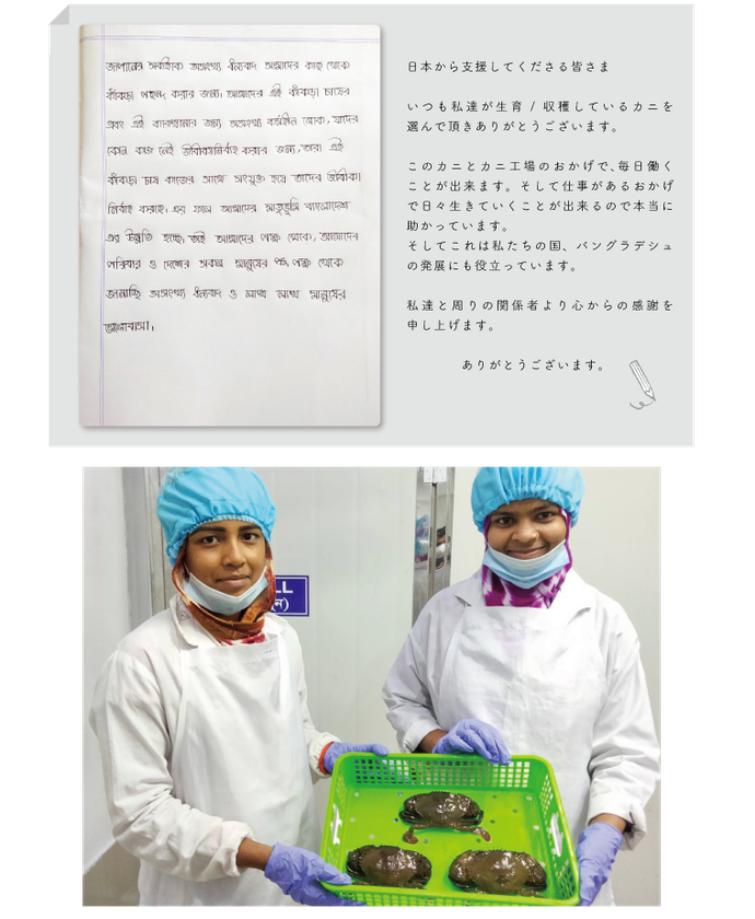 また、私たちは社会貢献に力を入れており、その一環として、バングラデシュにカニ工場を建設し、その地で生育した天然のカニを使用しています。