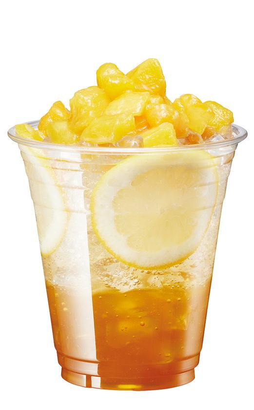 カチカチに凍らせたマンゴーを贅沢にたっぷり使用し、マンゴーソース、ハチミツ、ソーダを組み合わせてさまざまな味わいが楽しめるドリンクに仕上げました。スライスレモンも爽やかさのアクセントになっています。