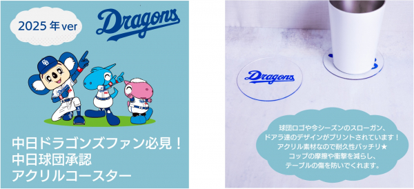 ● 球団ロゴやドアラなどのマスコットキャラクターがデザインされたかわいいコースターが多数ございます。