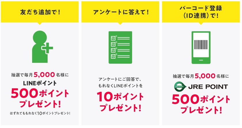 抽選で毎月5,000名様にLINEポイント500ポイントプレゼント。外れても、もれなくLINEポイント10ポイントプレゼント