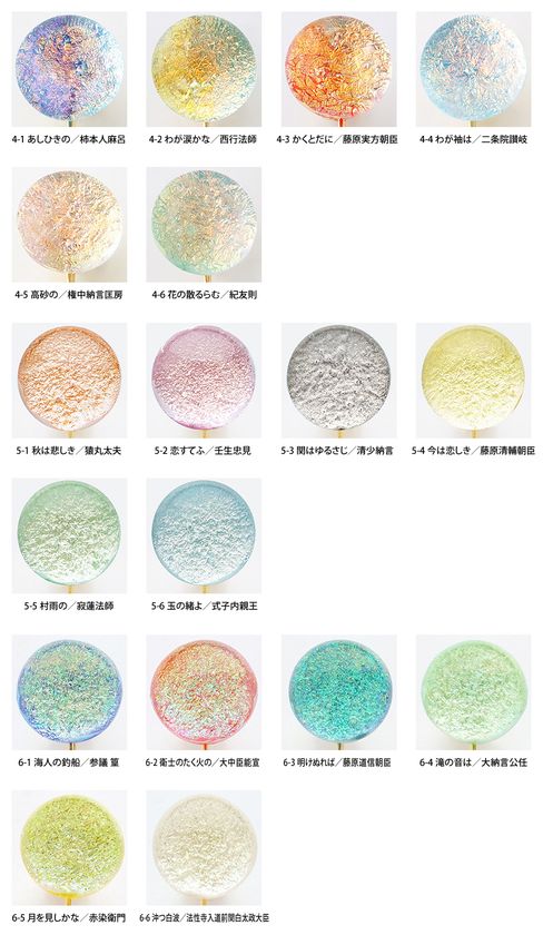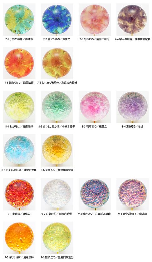 和歌か、詠み手か、ガラスの色で選ぶのか…。皆様のお気に入りをぜひ投票してください。