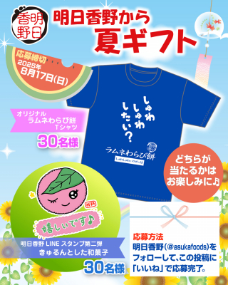 このたび、明日香野のオリジナルグッズかLINEスタンプがもらえるキャンペーン「明日香野から夏ギフト」を開始しました。キャンペーンの開催期間は2025年8月4日から8月17日までとなります。
