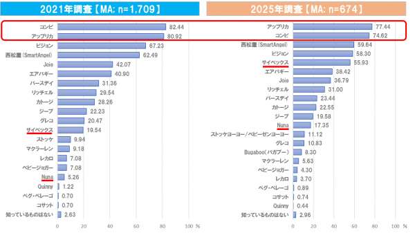 特に「サイベックス」は2021年の19.54%から2025年には55.93%へと大幅に上昇し、「Nuna」も5.26%から17.35%へと認知度を伸ばしている。日本の市場においても、海外ブランドの存在感が増していることが見て取れる。