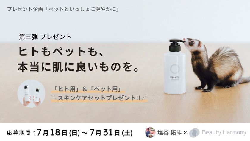 株式会社ビューティ・ハーモニィー(本社:東京都国分寺市、代表取締役社長:高橋 絵美子)は、株式会社リプカ(本社:東京都新宿区、代表取締役CEO:塩谷 拓斗)と共同で、2021年7月31日(土)までTwitterフォロー&RTキャンペーンを実施中です。飼い主もペットもやさしく洗うスキンケアセットをプレゼント!
