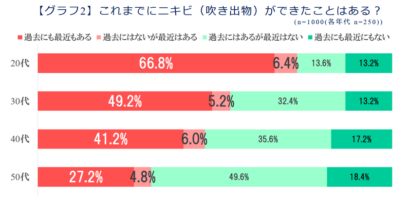 次に、最近の悩みで多かった「ニキビ(吹き出物)」について年代別に聞いてみました。「過去にも最近もある」、「過去にはないが最近はある」人の合計は、40代で47.2%、50代でも32.0%となっており、幅広い年代にニキビ悩みがあることが分かりました。