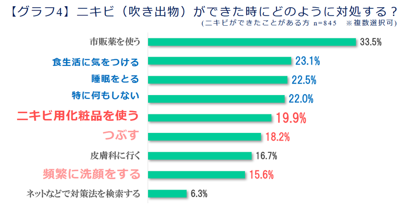 ■「ニキビ用化粧品」での対処は約20%。「つぶす」人は18%も!